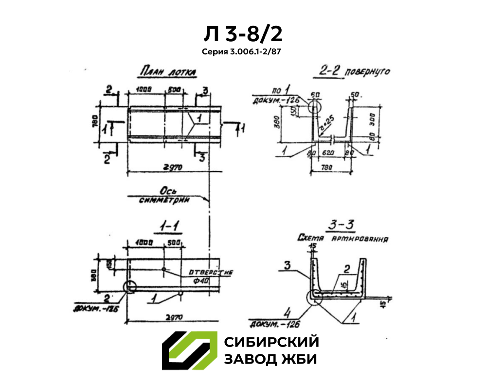 Лотки для теплотрасс Л 3-8/2, изготовленные по серии 3.006.1-2/87, представляют собой высокопрочные железобетонные изделия, имеющие форму перевернутой буквы «П». В боковых стенках этих лотков предусмотрены отверстия диаметром 40 мм.